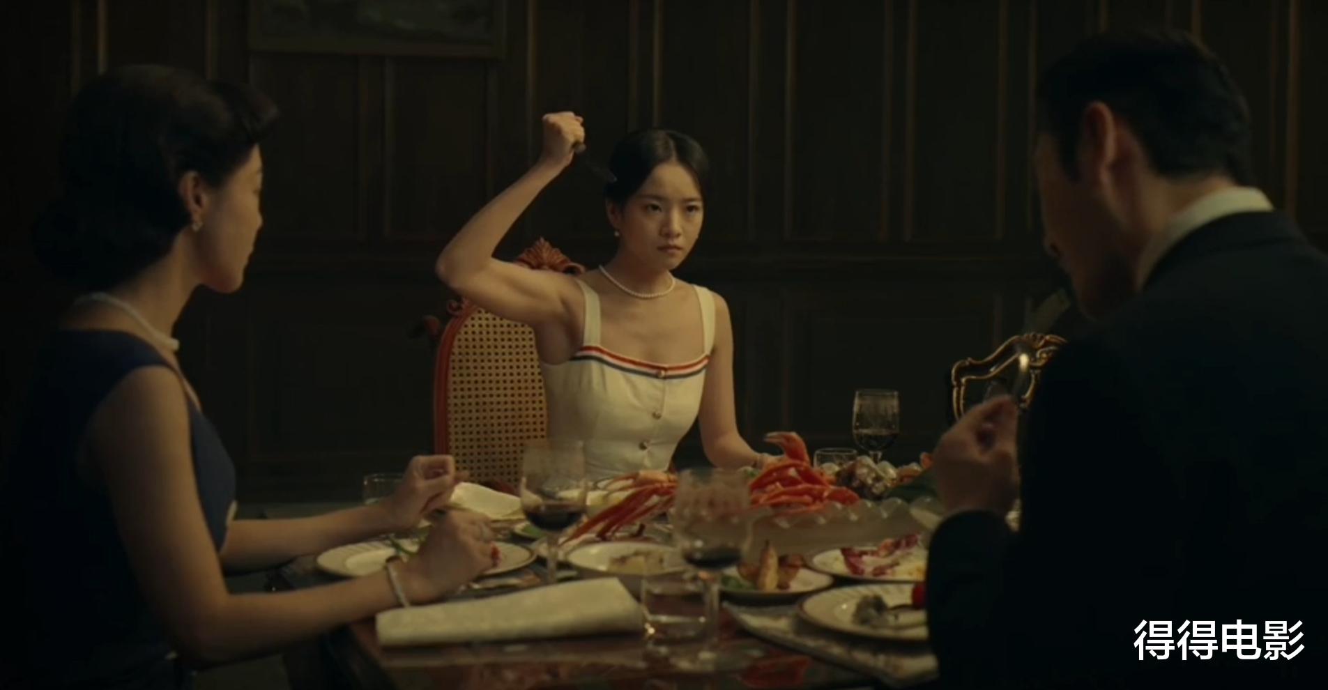 李庚希挠桌子、拍桌子、拿刀、吃肉、最后女佣摔破碗,每一个动作每一个镜头都在一惊一乍。