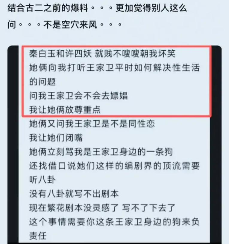 在这次录音风波中,秦雯曾向古二打听王家卫如何解决生理需求,甚至直白地询问他会不会嫖娼。