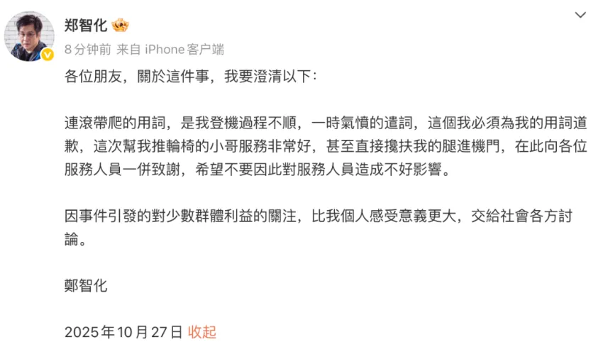 郑智化在视频中反复强调,自己本非有意针对某一个人,而是深圳机场关于残障人士设施与政策的确存在不小的问题。
