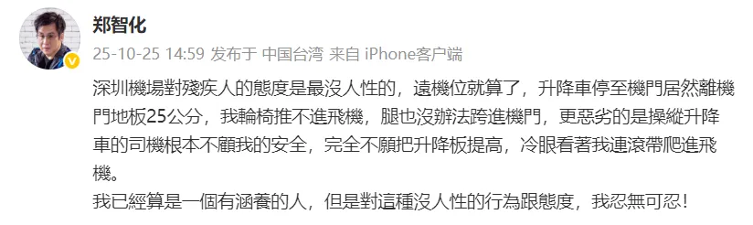 在微博中,郑智化直接怒斥「深圳机场对残疾人的态度是最没人性的」。