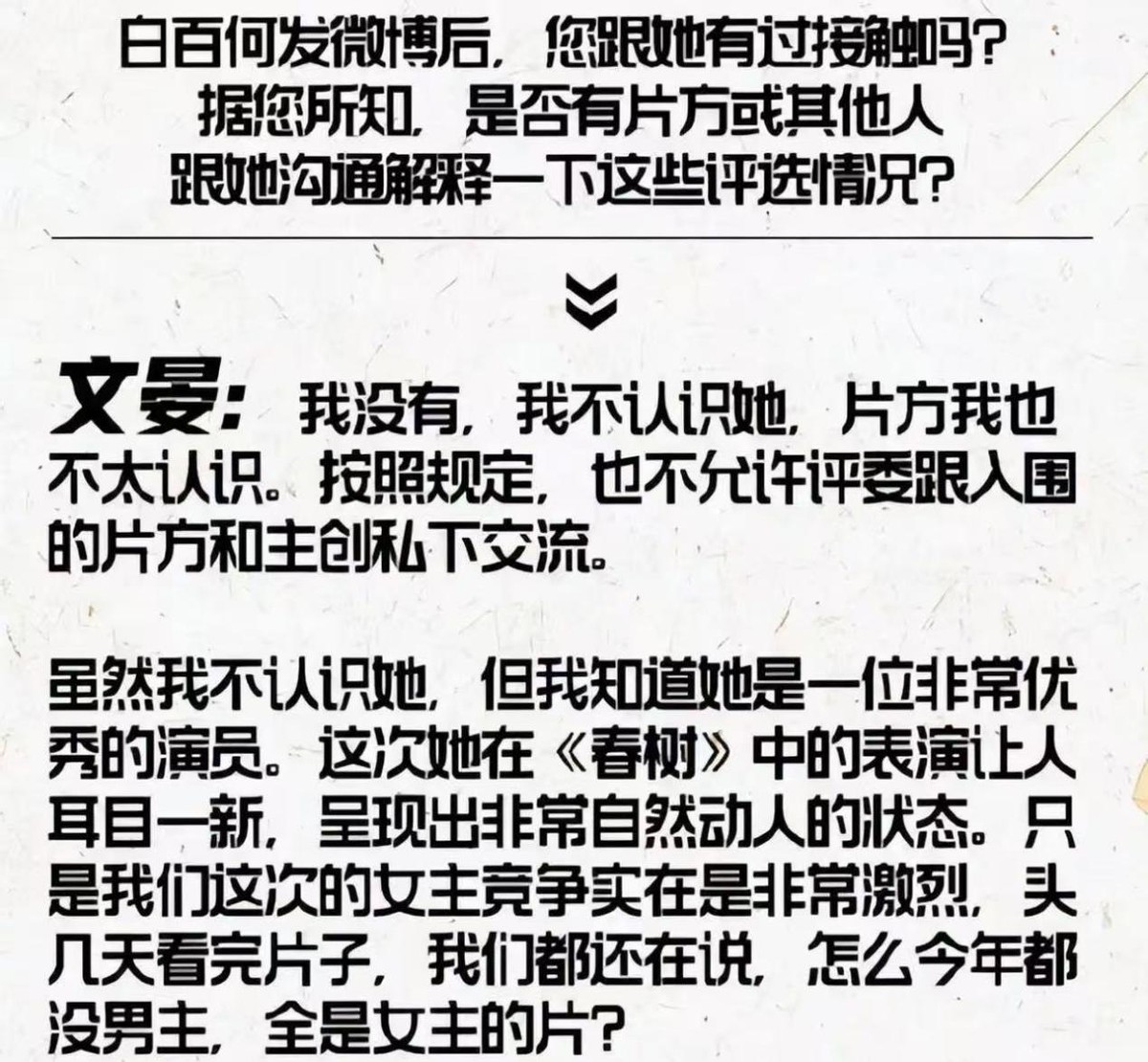 她强调,自己与王传君白百何都不相熟,且也没有与《春树》的片方接触过,因为这不符合规则。