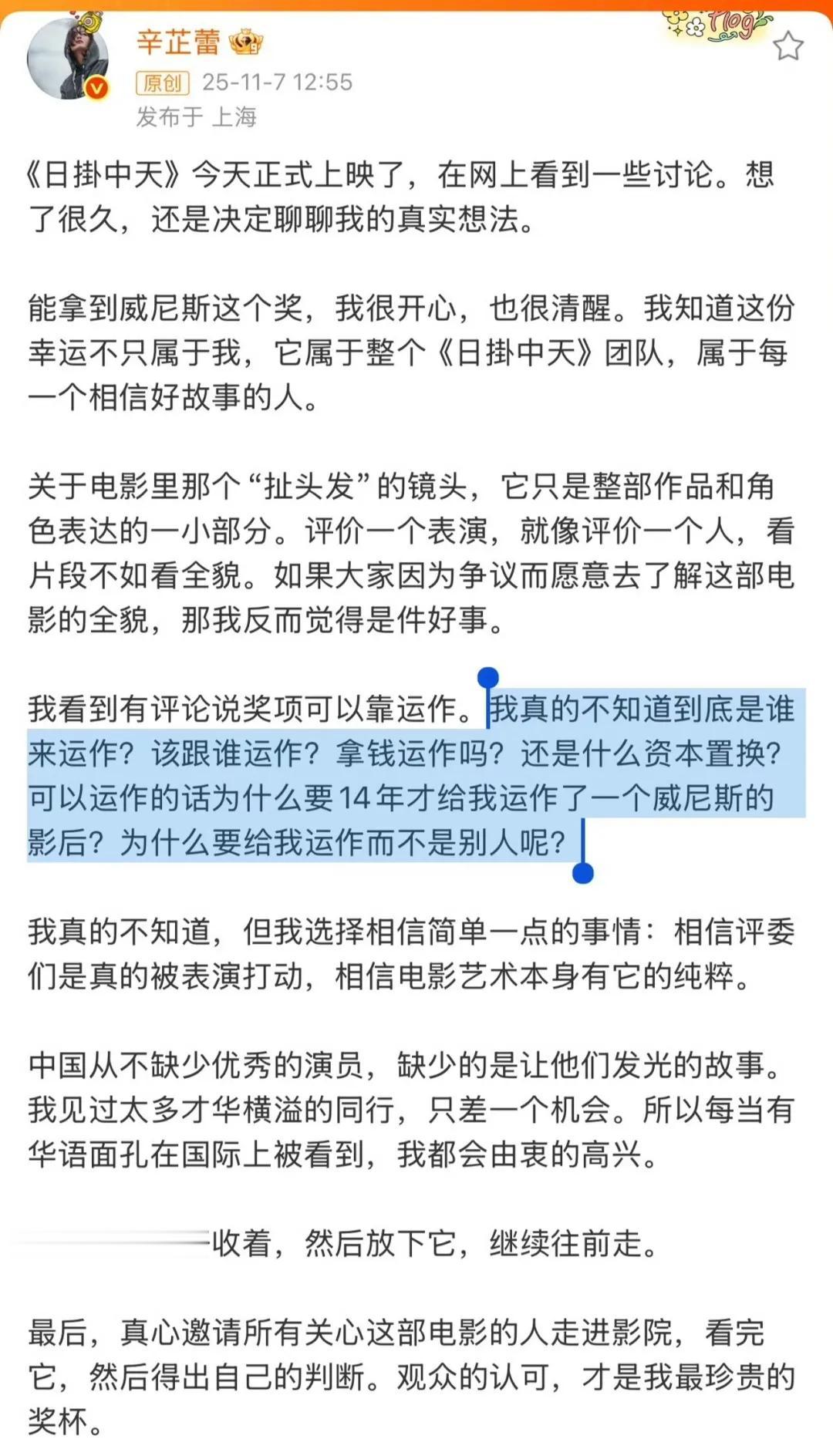 能拿到威尼斯这个奖,我很开心,也很清醒。我知道这份幸运不只属于我,它属于整个《日掛中天》团队,属于每一个相信好故事的人。