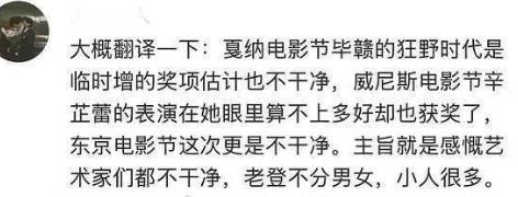 直接涉及辛芷蕾的是这一句:“威尼斯凭借一个女演员扯头发就可以得影后,这个影后还有含金量吗?”