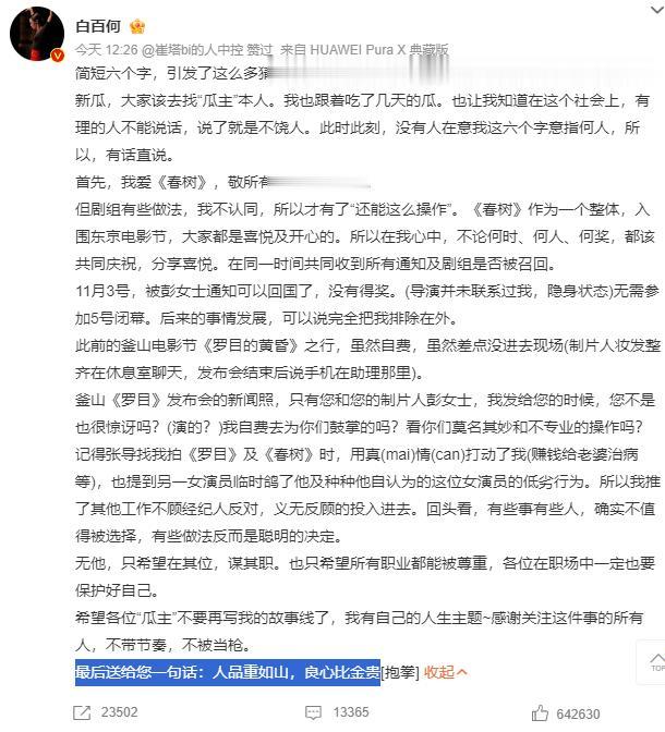 然而,她的发言夹杂了大量个人情绪和人身攻击(如“妈宝”、“街边吃饭”)。这极大地削弱了其批判的公共价值,使其更像是一次个人积怨的总爆发。特别是结合她疑似参演毕赣电影的戏份被删、自己作品未获奖的背景,其言论的“公正性”和“纯粹性”就大打折扣。